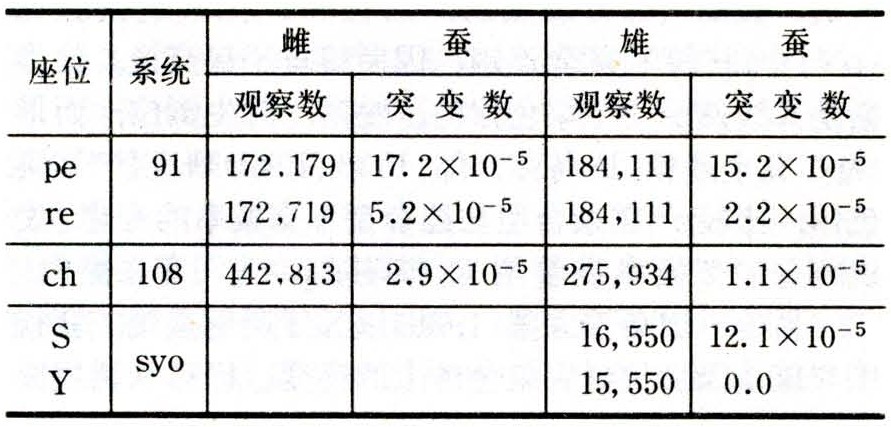 桑蚕后代中出现表型不同于正常型性状的遗传现象。蚕的突变类型分为自然突变和诱发突变(人为突变)两种。在自然情况下性状发生改变,并传给子孙者称自然突变。人为地对蚕卵、幼虫、蛹加以处理,随后在其子代中出现变异者称诱发突变。诱发突变按诱发因素性质又分为物理诱变与化学诱变。自然突变的频率极低,田岛弥太郎(1958~1959)调查,按每一遗传基因座位是10万次中发生次数的比率如附表。