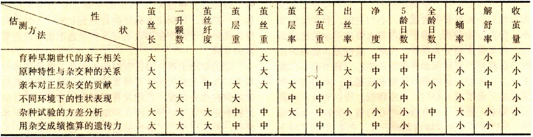 遗传力估值出现大于100或小于0的反常情况,主要是由于各种难于控制的试验误差所造成。一般算得的遗传力大于100时作100计,小于0时作0计。尽管各种试验报告所提供的桑蚕数量性状的遗传力估值差别大,但综合各方面的试验资料,蚕的各种数量性状间遗传力的相对大小还是比较一致的。桑蚕主要数量性状遗传力的相对大小如下表所示。
