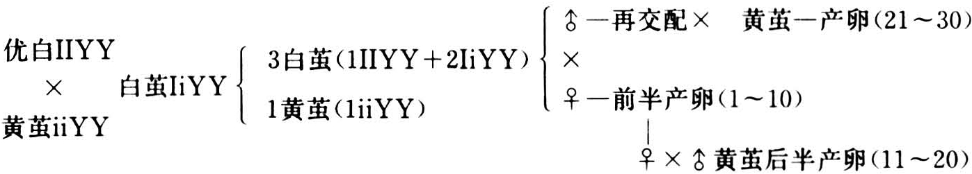 依上列型式杂交,顺次编号,将NO、1……30浸酸,分别饲育,或将NO:11~30先行一蛾饲育,调查茧色。若NO、1~10的10组中,某组合的雌与雄双方,在两个回交黄茧种次代组合中,均不分离黄茧,则该组合即系纯粹的显性白茧Ⅱyy×Ⅱyy组合。采用这个组合,即已固定了显性白茧性状。如果回交黄茧种的雄蛾,在斑纹茧形等方面具一显性性状,则较易判断它与产卵雌蛾再交配是否确实产生了效果。这样固定两对基因的显性性状,时间只要两代,蛾区数只要饲养30蛾,就能得到显性基因的纯合体。