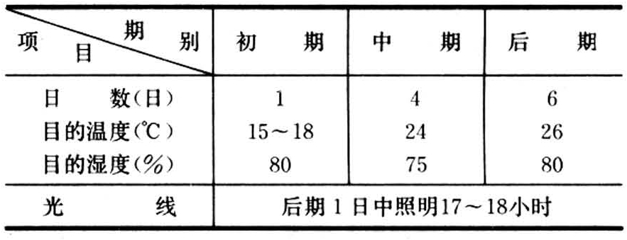 人工孵化种催青,基本上在温度较高时进行,化性变化问题较少。催青分前后两期。2化性及1、2化杂交人工孵化种的催青标准如下: