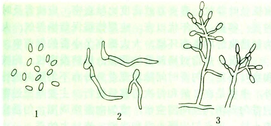 赤僵菌属束梗孢科,棒束霉属。学名为Isaria fumosa-rosea(casimir)Wize。分生孢子椭圆形或长椭圆形,长宽为3~4.2×2~2.5微米,单个孢子近无色,多数集聚呈桃红色。孢子在22℃左右吸湿膨大,从一端、两端或侧面长出发芽管侵入蚕体,发芽管渐次伸长,分枝发育成菌丝。菌丝细长,宽2.8~3.36微米,有隔膜,间隔距离不一,细胞膜无色透明平滑,内有不同的颗粒状油泡,呈网状繁殖。在繁殖处长出不同的结晶体,从菌丝顶部或旁侧产生短菌丝,呈长椭圆形或圆筒形,一端稍细,长宽为19~25×3~3.3微米,细胞膜无色透明,成熟后即从菌丝分离。已与菌丝分离的短菌丝,又能从一端或一侧发芽伸长为菌丝。菌丝充分生长繁殖,穿出蚕体,成气生菌丝,长短不一,呈树枝状分枝,由分枝形成棒状分生孢子梗。上端形成小梗,先端着生连锁状数个至十几个的分生孢子(图1)。
