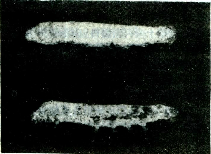 蚕感病初期,食欲减退,举动稍不活泼。体躯瘦小,皮肤呈污浊色,腹部生小点状黑斑,有的在脚基部出现黑斑,使脚失去活动能力而倒卧。感染后3~4天,黑斑出现更多,布及气门周围及胸腹两侧,蚕呈苦闷状,稍吐肠液(图2)。感染后4~6天死亡,尸体呈桃红色,硬化程度较差。死后1~2天,从环节间膜和气门开始长出白色气生菌丝,在多湿时,菌丝成束状,先端稍稍扩散,呈淡红色,再过2~3天,长出淡红色分生孢子,包覆全身。