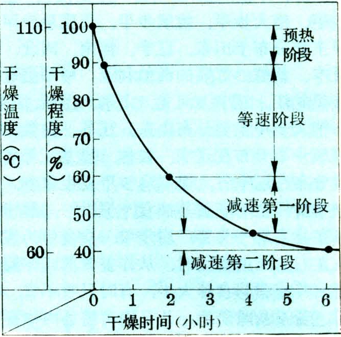 蚕茧干燥过程主要是蛹体水分在茧腔内不断进行内部扩散和表面蒸发并通过茧层中空隙向外发散的过程;可划分为预热、等速干燥和减速干燥等3个阶段;其中减速期间又有第1、第2两个阶段。①预热阶段:是鲜茧加热的时期。热量主要用于鲜茧加热的显热。随着茧体温度的逐渐提高、茧层水分先行开始蒸发的同时,热量通过茧层进入茧腔内杀死蛹体,破坏蛹体表面腊质层和角膜质的蛹皮组织后,推动蛹体水分进入蒸发旺盛期。②等速干燥阶段:是蛹体水分蒸发量最多、蒸发速度最快而大致保持一定的时期。在这期间内,茧内蛹体水分的内部扩散与其表面蒸发速度处于平衡状态;热量几乎全部用于水分蒸发的潜热;茧层由于有大量蛹体蒸发水分的通过,经常保持有一定的水分而不致于失水过干;茧层温度低于干燥室内的空气温度,蛹体温度又低于茧层温度。一直持续到由于蛹体水分逐渐减少,以致其内部扩散速度逐渐落后于其表面蒸发速度时转入减速干燥阶段。这时候虽然蛹体内部仍然潮湿,但其表面已经开始干燥收缩而产生凹陷、曲翘等变形现象。③减速干燥阶段:是茧内水分逐渐减到最少、蒸发速度转到最慢的时期。这时候由于所需蒸发潜热的逐渐减少,茧体温度因而逐渐升高到接近热空气的温度。当干燥深入到蛹体内部的少量水分蒸发时,减速干燥即由第1阶段转入第2阶段,直到茧层、蛹体两者都处于水分脱附平衡状态而干燥结束为止。各阶段经过时间及其干燥进度,按茧质和温、湿度等干燥条件而有不同。一般预热阶段约经半小时在烘率到达90%左右时结束;等速干燥阶段约经1.5~2小时在烘率到达65~60%时为止;减速干燥阶段约需3~4小时,减速第1阶段转入第2阶段时,烘率约在50%前后(见图)。