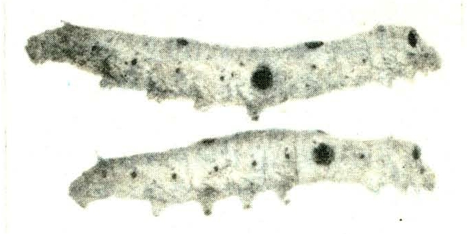 感染初期,外观与健康蚕无异。4龄病蚕的第2~4天,5龄病蚕的第4~6天,在体皮上呈现不少褐色以至黑褐色小病斑,比白僵病的小病斑着色明显,在气门周围和胸脚部出现时,大多呈圆形或不正形黑褐色大病斑(图2)。不久,患病蚕食欲减退,发育迟缓。取病蚕血液用显微镜检查,可看到浮游在血液内的短菌丝。