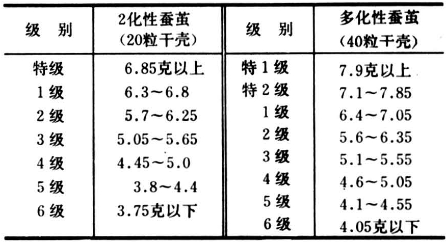 广东省地处亚热带,全年养蚕8~9次,蚕期高温多湿,为了保证茧质,鼓励蚕农出售半干茧;半干茧在茧站抽样茧125克进行缫丝,得出丝量,推算全批蚕茧的出丝量评价,广东俗称“围丝法”;另一种是抽样茧(2化性茧20粒,多化性40粒)检验干壳量定基本级,并抽样实测解舒率,进行补正升降。其干壳量分级标准与解舒率升降幅度如下表: