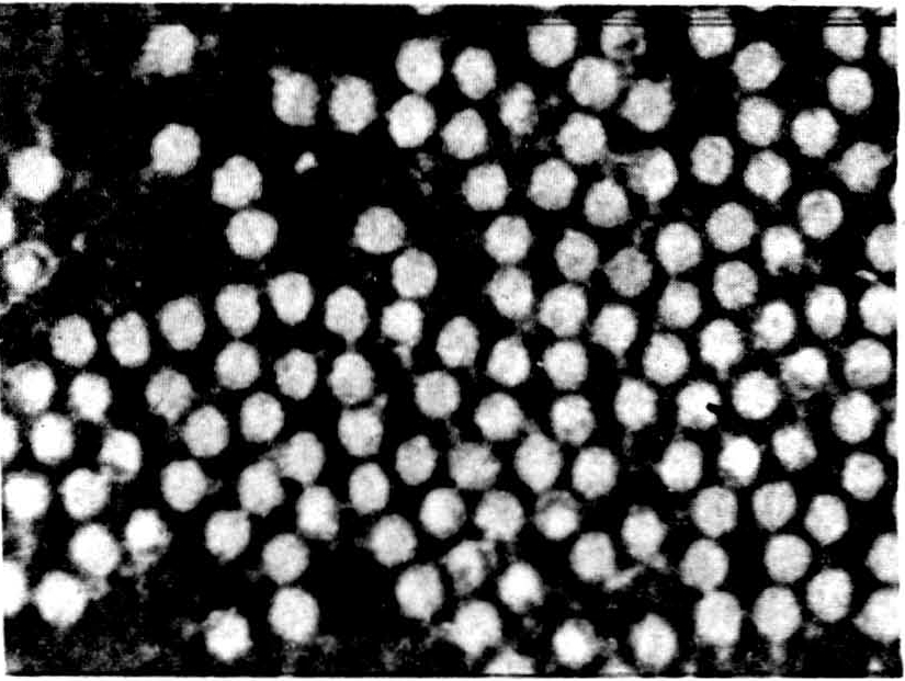 浓核病病毒属于细小病毒科,学名为Den-sovirus,简称DNV。病毒粒子呈球状,直径为20~23毫微米,沉降系数为100S左右,病毒核酸为单链脱氧核糖核酸(SSDNA),其含量与分子量因株系不同而略有差异。编码为D/1∶1.5~2.2/19~32∶S/S∶I/O(见图)。