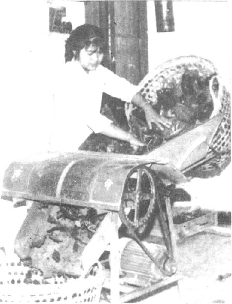 切桑叶是养蚕过程中比较繁重的工作,过去一直用切桑刀切叶,劳动强度大。中国从1949年开始研究,其结构采用滚刀式,滚刀横刀式、“T”、“Λ”形刀式三种,送叶形式有间歇送叶和连续送叶两种,有电动的也有手摇的。现在生产上使用的有多种型式,其中使用较多的为YM400—71型切桑机。本机由电动机、机架、侧板、送叶辊筒、变速传动机构、横刀(双螺旋刀)、圆刀组(共5组)、叶篓架及防护罩等组成。该机运转时,由木辊筒连续送叶,摆杆塔轮变速、圆刀、麻花刀切叶,切桑幅度为400毫米。外形尺寸为1004×760×1140毫米。切出叶片长度有;8~9、12~13、25~26,38~39及55~56毫米等5种,宽度有13、26、39、52及65毫米等5种。长宽组合可有22种,但一般只用13×13、26×26、39×39、56×56毫米几种近于正方形的切桑尺寸。条叶可用9×13、9×26、9×39……毫米等多种。切桑效率根据所切桑叶尺寸而不同,每台每人每小时切桑量为240~1666千克,比手工切叶提高10倍以上。该机一般用于2龄起至5龄饷食期切桑,每台机器所切桑叶量,约可供应饲养2500克蚕(蚁量)的食桑用叶。