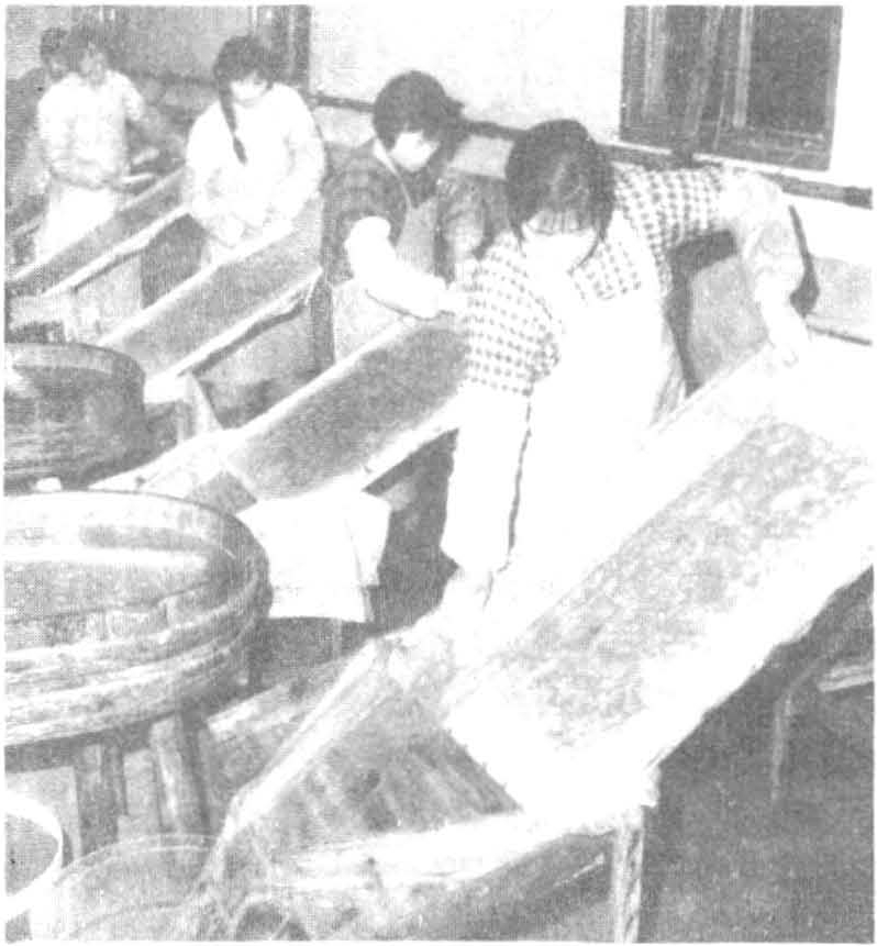 在进行散卵采种前,应先准备产卵用材料,一般秋用种用连纸,春用种用细白布或连纸。细白布宜在干燥不易发霉的冬季制作,其法是以面粉、菱粉、或山芋粉加水调制成稀浆,将布浸入其中,绞去余浆阴干后烫平,积存留用。连纸上浆则用排笔蘸浆涂上,上浆必须均匀周到,以便产于布或纸上的蚕卵,浸水后容易脱落。采种投蛾前须先称布或纸的重量,产卵后再称重量,即可预估蚕卵量(图1)。