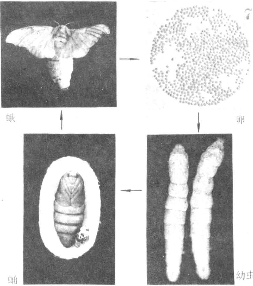 桑蚕是完全变态昆虫,一生经过卵、幼虫、蛹、成虫等四个形态上和生理机能上完全不同的发育阶段(见图)。卵是胚胎发生、发育形成幼虫的阶段,幼虫是摄取食物营养的生长阶段,蛹是从幼虫向成虫过渡的变态阶段,成虫是交配产卵繁殖后代的生殖阶段。整个世代只幼虫期摄食,并为蛹和成虫期的生命活动积贮营养。