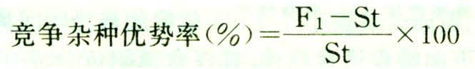 竞争杂种优势率是指1代杂种的重要经济性状方面不仅要超过其最优亲本,而且还要超过品种比较试验中最优良的标准品种(对照种)。因此这种杂种优势实用价值最高。竞争杂种优势率用下式计算: