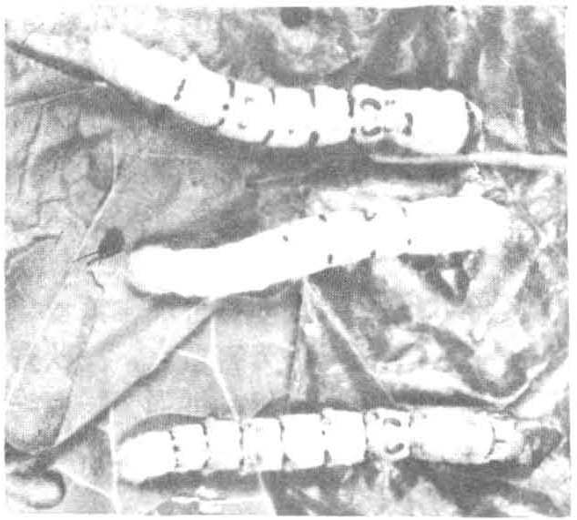 桑蚕吃食含氟桑叶,在小蚕期群体大小不匀、发育极其不齐、龄期显著延长,被害蚕体躯瘦小、体皮多皱、体色黄锈、胸部萎缩,行动不活泼,食欲骤减,甚至肠内空虚空头空身,眠前蚕体节间膜高起出现黑色环斑,大蚕被害个体体型差异虽小,但节间膜高起似脓病高节蚕,并在节间膜上出现由黑点联成的环状轮斑,极易皮破出血或吐水(见图)。解剖镜检被害蚕,并无传染性病变和病原,如切断污染源改喂正常桑叶,被害蚕的高节、环斑等症状会随蜕皮而消褪。拌随中毒发展如防病不严,末期多会并发传染性蚕病。硫化物污染桑经蚕吃下,表现行动不活泼,发育不齐,经过延缓,多呈软化症状。蚕吃氯化物污染桑后丧失食欲,吐浮丝、胃液。蚕吃粉尘污染桑后食欲下降,发育不良。