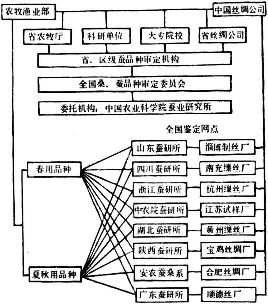 中国蚕品种鉴定工作由中央农业行政领导机构主持,设立全国桑、蚕品种审定委员会,并附设鉴定领导小组,处理鉴定工作(省级蚕品种鉴定的组织略同)。鉴定领导小组根据全国蚕业生产实际情况,制订和修改鉴定制度,如《家蚕品种国家鉴定细则》、《省蚕品种审定办法》等,使品种的鉴定和审定制度化、规格化。全国以重点蚕区省的科研或教育单位为全国蚕品种鉴定点,确定缫丝厂为丝质检验点(见示意图)。全年鉴定结束,由鉴定领导小组召开鉴定工作会议,汇总资料,上报中央农业领导机构,召开全国桑、蚕品种审定委员会会议,审议鉴定品种,作出合格与否的决定,指定推广品种。