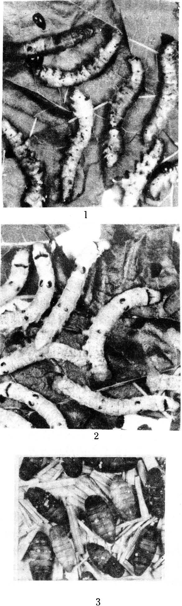 虱螨对桑蚕的幼虫、蛹、蛾都能为害,其中以小蚕期为害较大。小蚕被虱螨叮咬后,首先停止排粪,静伏蚕座中,口器与胸足微微颤动,呈假死状,其后体色渐渐变黑很快死亡。死后大多数头胸突出,也有表现体躯弯曲、吐水等症状,尸体不腐烂。大蚕期受害,发病较慢,但症状明显。起蚕被害,身体缩短,皮肤起皱,并有脱肛现象;盛食期受害,蚕体软化而伸长,节间膜附近往往有黑色斑点,排不正形粪或连珠粪或深褐色污液,头胸突出,吐水,有脱肛症状出现;眠蚕受害,其病症与虱螨寄生的迟早及数量的不同而有差异,有的不能蜕皮呈黑褐色而死亡,有的呈半蜕皮而死亡。有的虽能完全蜕皮,但体躯缩小呈黑斑蚕状,有粪粘结。化蛹初期,受害蛹体常发生黑褐色病斑,并可在环节间见到大肚虱螨,受害的蛹体成暗黑色。化蛹后期,蛹皮厚硬,不易受害。在蛾期,虱螨能寄生在蛾体的环节处,受害蛾的腹部弹力减弱。雄蛾发病后狂躁,雌蛾受害后产卵极少,不受精卵、死卵增多(图3)。
