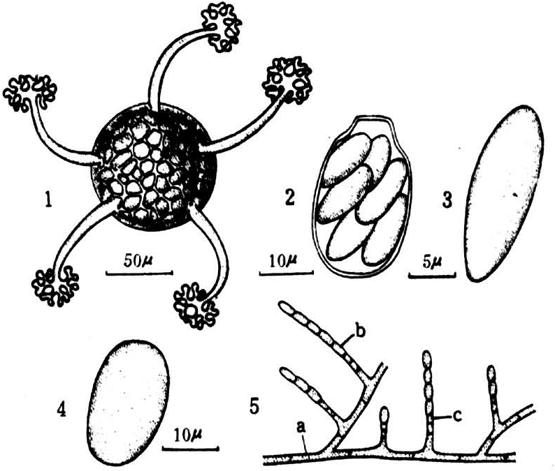 粉状叉丝壳属白粉菌科,叉丝壳属,学名为Microsphaera alphitoides G.et M.。主要寄生柞树的嫩叶和嫩梢。病原菌的发育分为闭囊壳、菌丝体、分生孢子3个阶段。①闭囊壳:一般在9月份由于气温下降和柞叶老化,白粉病菌开始出现有性世代——闭囊壳。成熟的闭囊壳赤褐色或黑褐色,呈扁球形,表面龟裂,壳缘着生6~24根顶端双叉分枝的附属丝;囊壳直径81~126微米,附属丝长63~130微米;囊壳中有4~22个子囊,每个子囊内有4~8个子囊孢子。②菌丝体:在20℃温度和相对湿度80%的条件下,子囊孢子吸水后长出芽管。继续生长形成无色透明有分隔的菌丝,紧贴在寄主表面上,再经数次分枝形成网状,此为营养生长阶段。然后从菌丝体长出一些膨大部分——掌状附着孢,牢固地将菌丝固定在寄主叶面。再从附着孢长出很细的侵入丝,伸入寄主并形成吸器,借以吸收营养。当营养生长成熟时,便于菌丝垂直方向长出分生孢子梗和形成分生孢子。③分生孢子:椭圆形,无色透明,常常几个至20几个链生在分生孢子梗的顶端,形成一串晶莹的分生孢子(见图)。