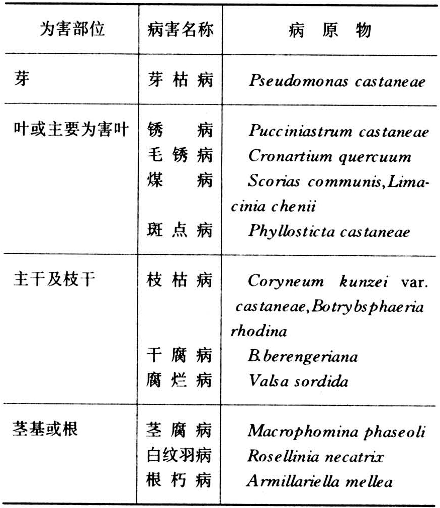 为世界性病害,中国广为分布。主要为害叶片、新梢、幼芽和栗苞,初产生不规则形褪绿斑,上生白色粉状物(病菌菌丝体、分生孢子梗和分生孢子),后期产生黑色小粒(闭囊壳)。以后病部变黄枯焦,严重时幼叶扭曲,幼苗死亡。以苗木,幼树受害较重。病原物为槲球针壳(Phyllactinia roboris),中国叉丝壳(Microsphaera sinensis)和绵毛离壁壳(Cystocheca lanestris),属子囊菌、白粉菌目。绵毛离壁壳和槲球针壳主要寄生在叶背面,中国叉丝壳主要寄生叶正面。还可为害茅栗、栎和栲等树种。温暖干旱的气候条件有利于病害流行。病菌以闭囊壳在病叶或病梢上越冬,次年4、5月释放子囊孢子,借风传播,进行初侵染,再侵染频繁。病害控制,要加强栽培管理、合理灌水施肥,多施钾肥以及硼、硅、铜、锰等微量元素,控制氮肥,以提高树体抗性;清除病叶,发芽前喷布波美1度石硫合剂;发病初期可喷布甲基硫菌磷、粉锈宁或硫制剂。