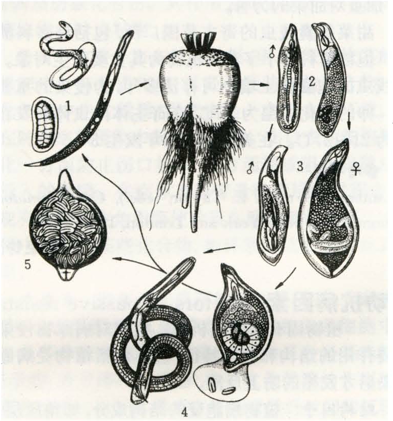 胞囊线虫是具有高级寄生性的线虫类群,普遍在根部内寄生,长时间在特定点上固定取食。取食点是一个多核的合胞体(syncytium),起源于寄主的部分中柱-皮层组织,由侵入根表皮并且迁移至中柱附近的2龄幼虫,诱导有关细胞的部分胞壁溶解或穿孔和胞质合并形成。在合胞体和其周围的正常细胞之间有许多解剖学上的差别。如合胞体的细胞器猛增,中央液泡消失,胞核和核仁膨大变形呈变形虫状和胞壁特别是在中柱附近的胞壁上增生许多内长物(ingrowths)。这些特征与健康植株中短距离运送溶质的特化细胞即转运细胞(transfer cells)的解剖学特征相同。因而认为该合胞体起着不断供应胞囊线虫所需营养物的作用,是这类线虫的营养细胞。