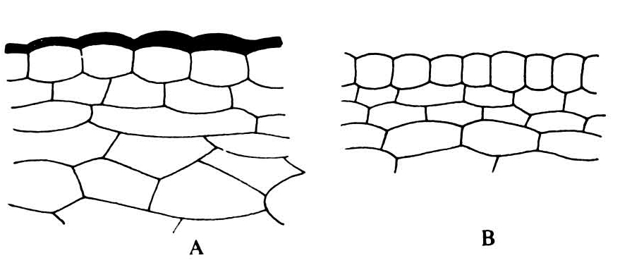 图1 番茄对灰葡萄孢抗病品种(A)和感病品种(B)的表层切面图(角质层涂以黑色)(引自Ainsworth,Oyler and Read,1938)