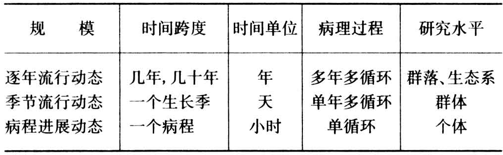 病害流行时间动态按研究时间的长短,可分为三级(见表):