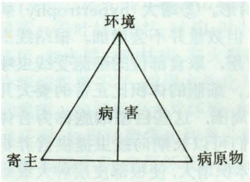 用三角图形表示侵染性病害体系中寄主、病原物和环境三者相互关系(图1)。当三者以最适合发病条件相遇时,寄主发病,损失最大;如果任何一方完全不适于发病时,即不发病;有一方或两方不太适合发病,病害就轻,损失亦小。