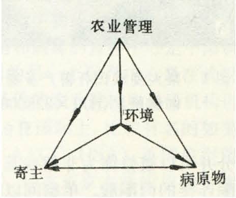 是以病害三角为基础加上农业管理而组成的整体(图2)。人类农业管理活动对寄主植物的选择、抗性的利用,病原物的种群控制、农业环境、尤其是农田小气候的改造与影响,都有直接和间接的作用,从而影响病害的发生与流行。