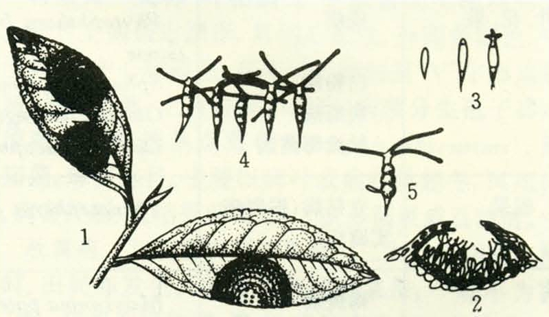 病原物为茶拟盘多毛孢,属半知菌,黑盘孢目,有性态未发现。分生孢子盘表生病斑两面,直径88~176微米,球形至双凸镜状。成熟后突破寄主表皮组织,逸出黑色分生孢子团。分生孢子梗在子座上表形成,无色,圆柱形,直径1~5微米,长10~15微米,有1~5次连续性的层出现象。分生孢子纺锤形,5胞,分隔处缢缩,大小23~35×5.5~8(微米),中间3胞暗橄榄色,顶胞和基胞无色,顶生3根附属毛,个别2~4根,无色,末端成结状膨大,长25~50微米。基胞小、柄直,无色,长4~10微米,末端稍膨大。病菌最适生长温度28~30℃,孢子萌芽的最适温为28~32℃,低于18℃不能形成孢子。病菌生长最适pH值为5.0。孢子形成与光线有关,培养7~8天的菌丝体经20小时以上光照处理,孢子形成量最多,在完全黑暗条件下,不能形成孢子。