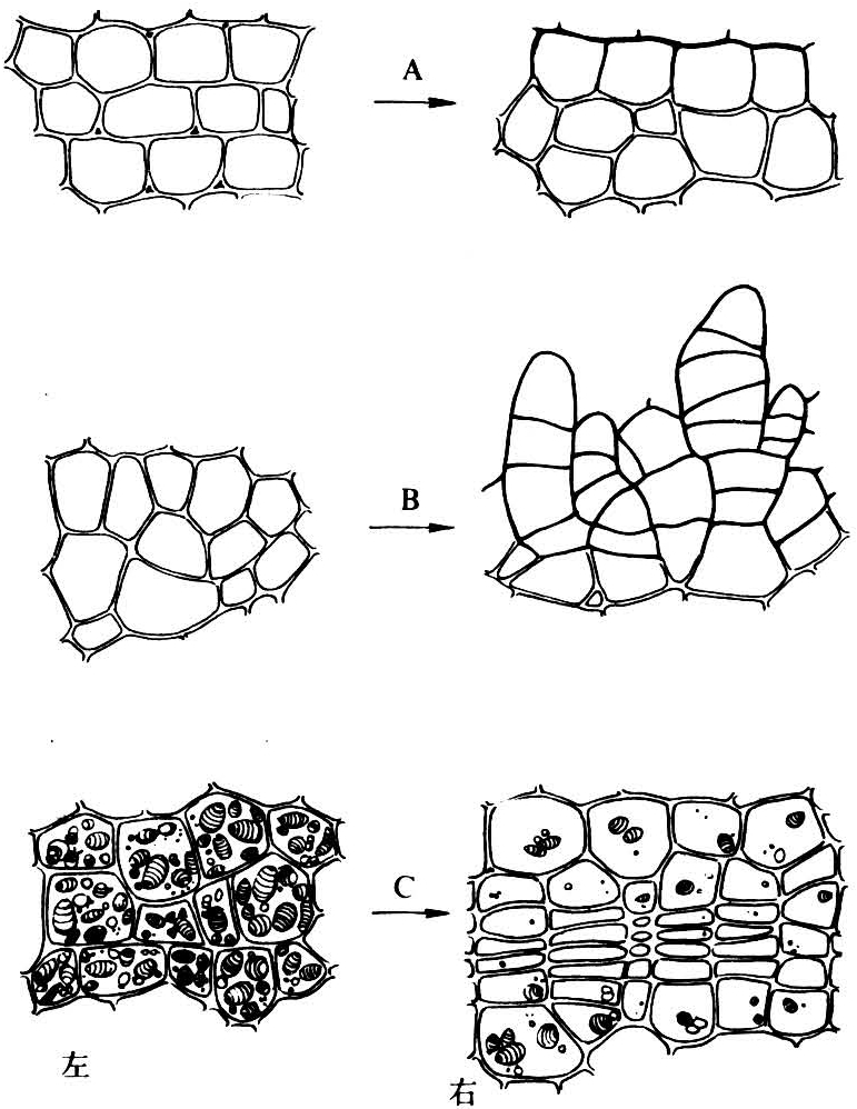 主要是木质素和其它不溶性酚类物质及富含羟脯氨酸糖蛋白向细胞壁的沉积。在植物中这一反应与植物对微生物侵染的抗性有关。用PAL酶的竞争性抑制剂氨基羟乙酸处理马铃薯块组织,木质素积累量降低,组织对瓜枝孢变得敏感。细胞壁中多聚氧化型绿原酸和脂化的ρ-香豆酸及阿魏酸在植物对病原物的抗性中也有作用。软木脂是1种复杂的异质性多聚体,由脂族化合物共价结合到酚骨架上形成,其性质类似木质素。伸展素是1种结构蛋白,属富含羟脯氨酸的糖蛋白,其重要特征之一是在细胞壁中的不溶性,因而可能是植物受伤后形成的结构屏障的重要组分。细胞受伤后上述多聚体物质对细胞壁的修饰使得细胞对病菌侵染产生抗性。其原因是:①细胞壁变得能抗多糖酶的降解;②修饰后的细胞壁能有效地阻止营养物质向细胞外扩散从而饥饿病菌;③阻止了病菌酶、毒素及其它致病因子与健康细胞的接触;④使得植物保卫素和其它抗生物素不致扩散,从而在侵染点处积累到较高的浓度;⑤在木质素生物合成过程中,其酚类前体分子,尤其是聚合过程中肉桂基醛类和自由基及侵染过程中从多聚体释放的类似物质具有抗菌活性。