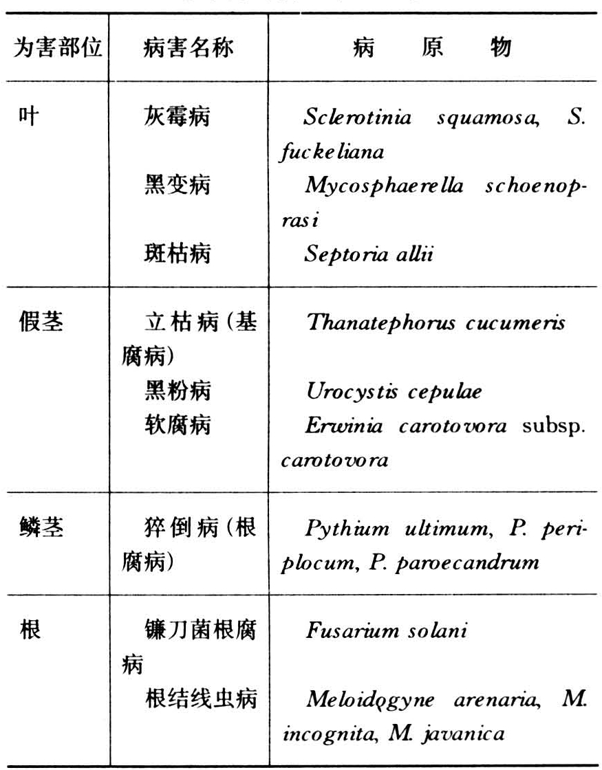 全世界已知40种以上,至1991年中国的洋葱病害约20种,大蒜病害近10种,葱类病害10多种,韭菜病害近10种,其中有许多共同性病害。最重要的病害是锈病、紫斑病、霜霉病和疫病。较重要的还有叶枯病、灰腐病、炭疽病、白腐病、白绢病、曲霉病、青霉病、镰刀菌腐败病和黄矮病。