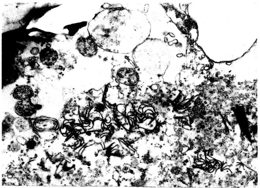 病原物为大麦黄花叶病毒(Barley yellow mosaic virus,BaYMV),病毒粒子为线状,细长稍弯曲(图1),宽约12毫微米。提纯病毒长度多为300~600毫微米,在370和550毫微米有2个分布峰。病毒粒子外无脂膜。粒子分散于细胞质内,或以粒子束成集块状。病叶超薄切片,电镜可观察到细胞质内有风轮状、膜状、柱状、束状内含体及板状集结体(图2),但无卷筒体和胞核内含体。用胶体金免疫电镜技术标记黄花叶病的大麦细胞,除在病毒粒子上有特异金颗粒标记外,有时还在风轮状或柱状体上也有特异标记,证明这些内含体上存在病毒外壳蛋白,而在膜状体上无标记。