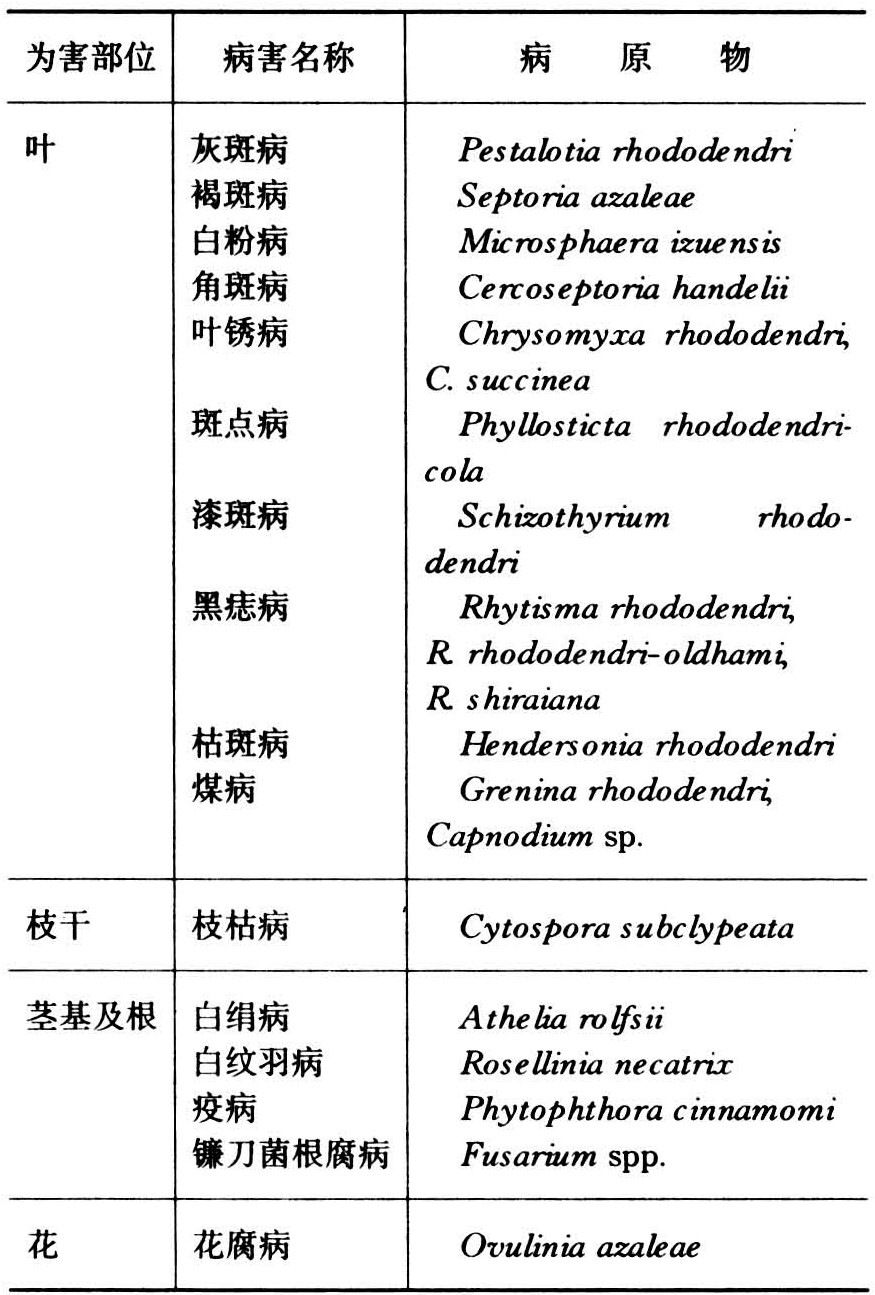 此外还有类菌原体(MLO)引起的丛枝病以及中国尚无报道的毁灭性芽枯病(Brosia azaleae)和致使严重死株的死顶病(Botryosphaeria berengiriana)。其他常见的病害见下表。