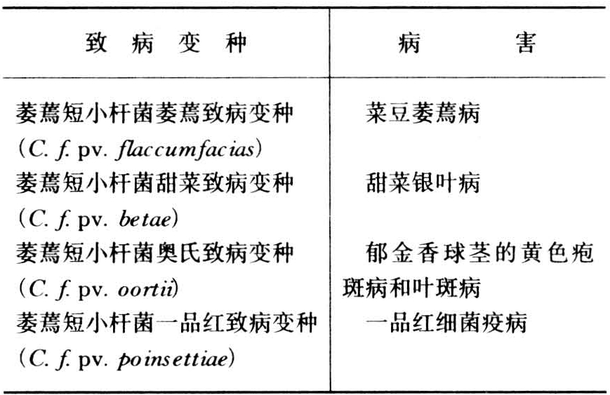 萎蔫短小杆菌〔Curtobacterium flaccumfaciens( H e d g e s), J o n e s〕革兰氏反应阳性,直或微弯短杆状,或楔形,大小为0.3~0.6×1.0~3.0(微米),老培养物中出现一定б例的球状细胞。一般以单细胞为主,也可出现V、Y和栅栏状排列。有些菌系能运动。在琼脂培养基上生长3—4天的菌落直径1~4毫米,光滑、全缘、低凸,呈黄、橙黄、粉红色,有些变异菌株可丧失色素,有些可产生蓝—紫色的水溶性色素。生长需要硫胺素、生物素和泛酸盐。生长适宜温度24~27℃,在7%~9%氯化钠溶液中也能生长。好气菌。能利用葡萄糖、蔗糖、纤维二糖等多种糖、醇弱产酸,但不能从糊精、菊糖、肝糖或淀粉产酸。过氧化氢酶阳性,氧化酶阴性。水解七叶苷和淀粉。甲基红阳性。不还原硝酸,也不从蛋白胨产生氨。不液化明胶和果胶盐凝胶。但从盐酸半胱氨酸产生硫化氢。细胞壁肽聚糖等细胞成分分析的特性与属相同。DNA的G+Cmol%含量为68.3~73.7。该种包含4个致病变种,它们与萎蔫短小杆菌具有较高的DNA同源性,生理生化特性也相似,但寄主专化性不同,引起的病害见表。