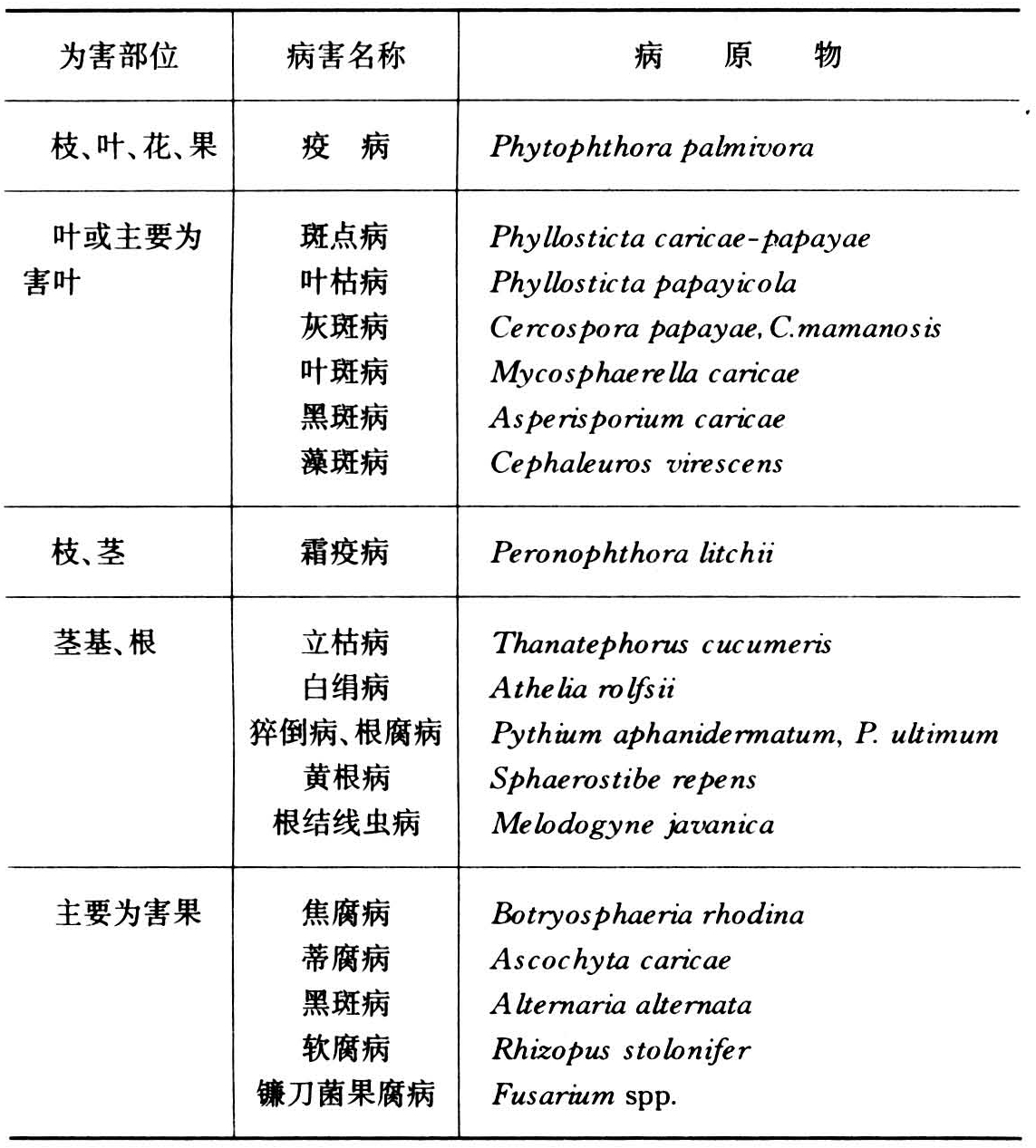 世界已报道约70种,至1991年中国有近40种。重要病害有环斑病毒病和炭疽病和白粉病。环斑病毒病番木瓜最主要的毁灭性病害,1929年在牙买加首次报道为花叶病。1945年鉴定为番木瓜环斑病毒,中国1932年最初报道为花叶病,1964年被鉴定为番木瓜环斑病毒。1962年后在中国大陆主产区流行,台湾省1978年始报道,后严重爆发。症状为新叶呈黄绿相间的花叶,顶叶变小
