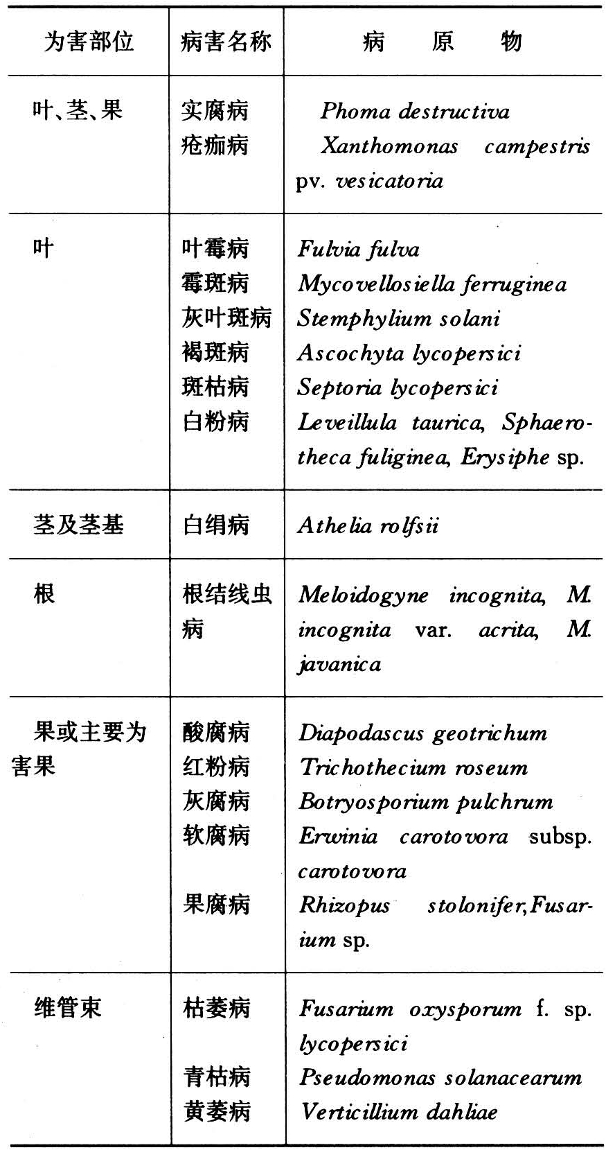 田间已被侵染而混入贮库的产前病害有晚疫病、早疫病、炭疽病、灰霉病、褐色腐败病、钉斑病等,采后侵染的病害主要有青霉病、酸腐病、黑斑病、灰腐病、红粉病、镰刀菌果腐病等。