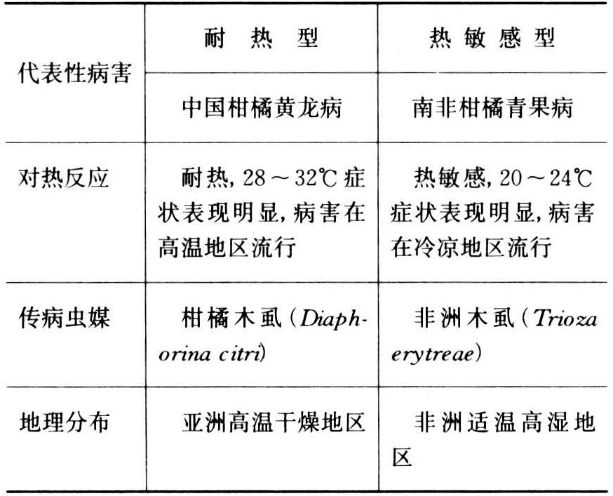 菌体,在外层壁与内层膜之间,发现有电子密度较浓的肽聚糖层(peptidoglycan),表明病原物细胞壁构造与革兰氏阴性细菌十分相似。法国博夫(J.M.Bove)认为是一种革兰氏阴性细菌。根据病原物对热的敏感性、不同虫媒和地理分布,本病可分两类,即耐热型(亚洲型)和热敏感型(非洲型)(见表)。中国柑橘黄龙病属于耐热型