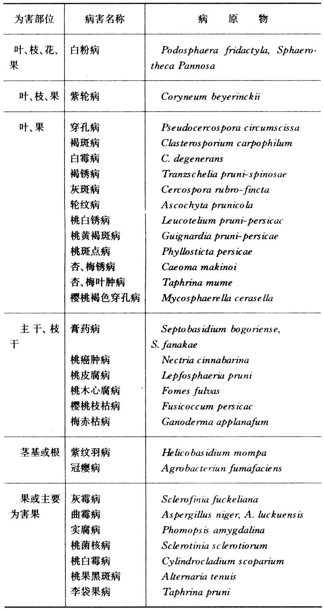 已记载的桃、李、杏、梅及樱桃等核果类果树病害近200种。中国有桃病害50多种,李病害30多种,杏病害30多种、梅病害20多种,樱桃病害10多种。不同的核果可以有共同的病害。最重要的病害是核果褐腐病、炭疽病、缩叶病、疮痂病、流胶病及冠瘿病。较重要的有细菌穿孔病、腐烂病、软腐病、李红点病、杏疔病及樱桃丛枝病。