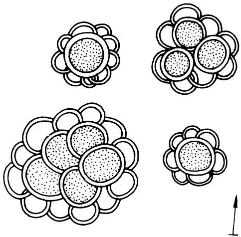冬孢子堆多生于寄主子房,少数种寄生其它部位,粉状或带胶性,常有恶腥气味;冬孢子单生,周围有无色或带色的胶质鞘,表面具网状、刺疣状花纹,少数为光滑的。膜的一边偶有不明显的突起呈尾状,较冬孢子直径短。孢子堆中常有许多外形似不育细胞未成熟的孢子;冬孢子萌发产生无隔担子,顶端簇生担孢子(图2)。是黑粉菌目重要的属,有许多重要植物病原菌,多寄生于禾本科、蓼科、大戟科等植物。已描述90种,中国报道13种。常见种有引起小麦腥黑穗病的小麦网腥黑粉菌〔T.caries(DC.)Tul.〕和小麦光腥黑粉菌〔T.foetida(Wallr.)Liro〕,以及引起小麦矮腥黑穗病的小麦矮腥黑粉菌(T.contraversa Kuehn)。