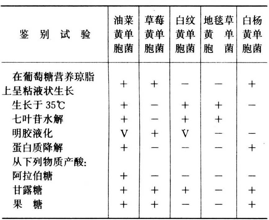 黄单胞菌属的属、种和种以下的分类从表型特征的数值分析,DNA-DNA同源性,rRNA-DNA杂交技术等方面进行研究。虽然黄单胞菌属和假单胞菌属的一些成员共享rRNA-DNA同源性,而黄单胞菌属特有的黄单胞菌色素和对植物的致病性以及一些生理生化特性与假单胞菌属明显不同(表1)。《伯杰细菌鉴定手册》第7版记述黄单胞菌属有120个种。数值分类和D N A同源性的研究表明黄单胞菌属只有少数种。1974年新西兰戴伊(D.W. D ye)等对大量菌株的表型特征分析发现只有4个种与典型种油菜黄单胞菌的生化试验有明显差异,因此在《伯杰细菌鉴定手册》第8版和《伯杰系统细菌学手册》列出5个种,即油菜黄单胞菌、白纹黄单胞菌、地毯草黄单胞菌、葡萄黄单胞菌、草莓黄单胞菌,其余种列为油菜黄单胞菌的致病变种。1978年根据表型特征,曾将白杨溃疡病的病原细菌(Aplanobacterium popu-li)移入本属作为一个种,即Xanthomonas populi,即将有效发表。近年来,根据rRNA-DNA杂交,DNA-DNA同源性等测定,已确认葡萄黄单胞菌与黄单胞菌无相关性,建议将这个种移出黄单胞菌属,成立一个新属。1990年б利时史温(J.Swings)等根据表形特征,遗传和化学特性的研究,提出油菜黄单胞菌水稻致病变种应提升为黄单胞菌属的一个种,命名为水稻黄单胞菌,包含两个致病变种,即水稻白叶枯病的病原菌X.oryzae pv.oryzoe和水稻细菌条斑病的病原菌X.oryzae pv.oryzicola。黄单胞菌属几个主要种的鉴别试验见表2。