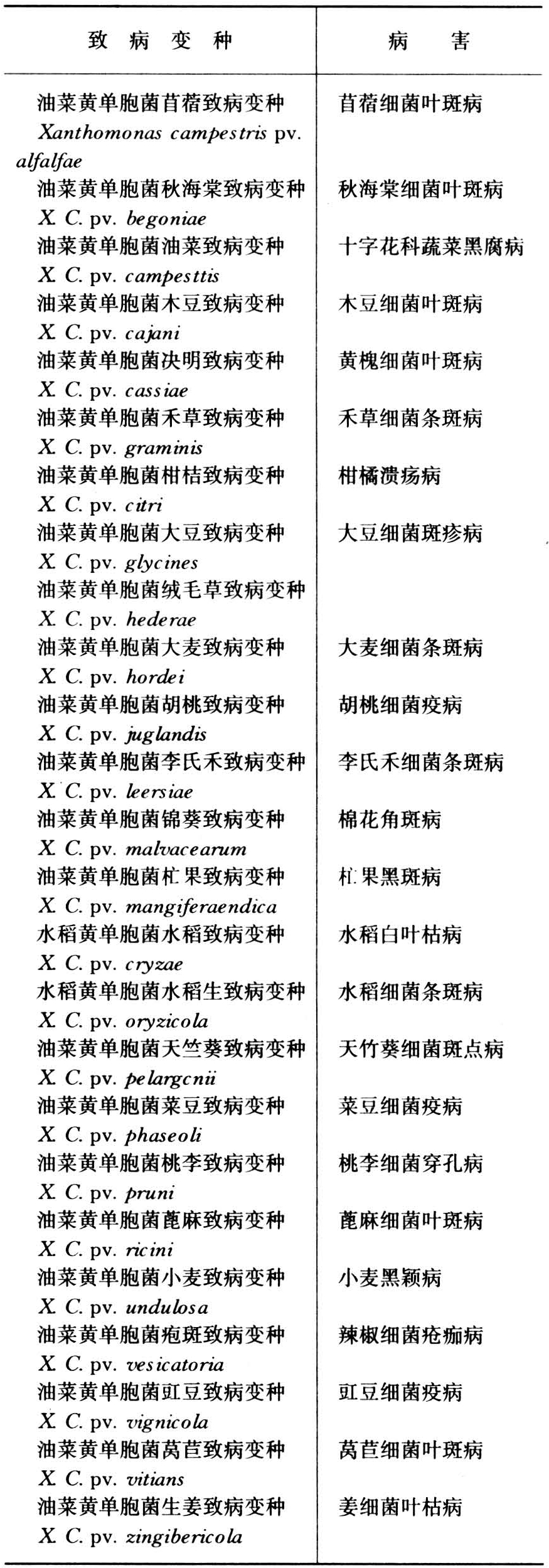 黄单胞菌属的绝大多数成员为植物病原菌,引起的植物病害遍及全世界,几乎所有高等植物的主要科属植物都发生一种或多种病害。主要症状是叶、茎、果实上的坏死斑(斑点、条斑、溃疡)、萎蔫、腐烂等。十字花科蔬菜黑腐病是世界性病害,水稻白叶枯病和细菌条斑病、禾谷类黑颖病、柑桔溃疡病等都是中国的重要病害。中国报道的油菜黄单胞菌致病变种及其所致病害见表3。