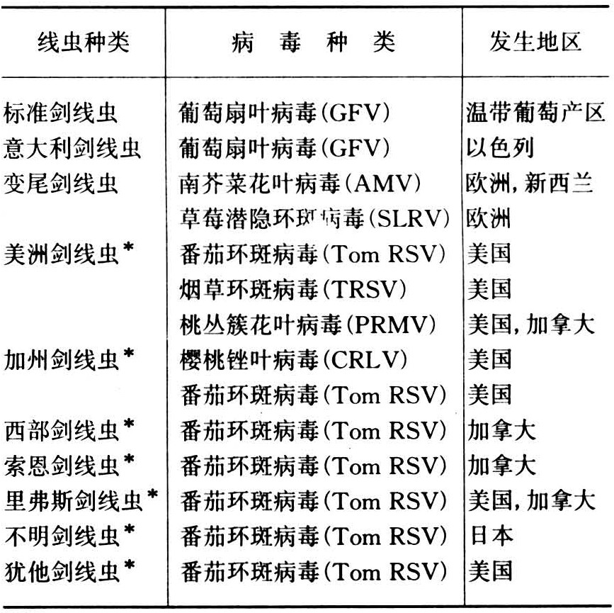 对寄主植物表现明显致病性而具经济重要性的剑线虫有以下几种。美洲剑线虫(X.americanum Cobb)主要分布于美国和加拿大东部,在亚洲、南美洲和大洋洲也有零星记载。该线虫寄主广泛,包括各种果树、森林树木、多年生观赏植物和草莓。受害植物长势不良。复尾剑线虫[X.diversi-caudatum(Micoletzky)Thorne]广泛分布于欧洲各国及美国、加拿大、澳大利亚和新西兰。报道受害的经济作物有悬钩子、苹果、桃、无花果、草莓、胡萝卜、三叶草等。标准剑线虫(X.index Thorne&Allen)几乎发生于世界各温带地区的葡萄园。寄主除葡萄外还有无花果、苹果、桃、柑橘、草莓等。短颈剑线虫(X.bre-vicolle Lordello&Da Costa)属世界性分布,在以色列造成柑桔、葡萄和玫瑰长势衰退。该线虫在中国普遍发生,可为害各类果树、月季、葡萄、草莓、油菜、蚕豆等。贝克剑线虫(X.bakeri Williams)和钱伯斯剑线虫(X.chambersi Thorne)局限于加拿大和美国,为害多种森林树种和草莓。
