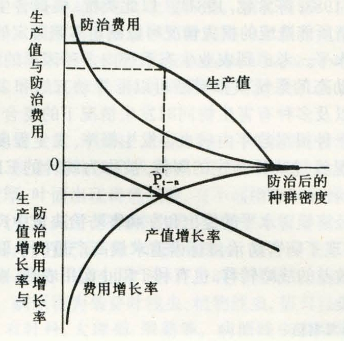 造成经济损失的最低有害生物种群密度。所谓经济损失是指防治费用与防治挽回损失金额的差值。针对预计流行后病情可能达到EIL的病害,如果进行防治,其收益正好等于所需防治费用。它是有害生物综合防治(IPC)或有害生物综合治理(IPM)理论的重要概念,是从经济效益出发确定的病害系统管理目标。经济损害水平最早由美国昆虫学家斯特恩(V.M.Stern,1959)等人提出并用于害虫综合防治。由于这个概念首次将经济学观点引入害虫防治理论,所以一经提出颇受重视。1972年黑德利(J.C.Headley)根据经济边际分析原理研究防治费用、防治收益以及防治的纯效益随着防治后害虫种群密度而变的曲线。他的结论是在不断加大防治压力降低害虫种群密度的过程中,随着种群密度不断下降,防治费用逐渐增加,越是要斩尽杀绝就越要提高防治强度和提高防治费用,而产值增长率却不断下降。在两条曲线相交之前,防治费用增长率始终低于产值增长率,增加防治压力总会提高纯效益。当防治害虫所产生的产值增殖率等于防治费用增殖率的情况下,防治的纯效益最大(见图示的Pt-n点)。这个控制后的种群密度即为经济损害水平(黑德利当时采用“经济阈值”的术语,Hall(1973)和Luckmann(1982)认为恰好是斯特恩定义的经济损害水平)。斯特恩把EIL作为权衡一场预计发生的病虫害是否值得防治的密度指标。对于最终流行程度低于这一指标的一场病害不应该进行防治;对于高于这一指标的流行进行防治则可能带来纯效益。黑德利则探求对于一场值得防治的病虫害究竟应该用多大的防治强度(防治次数、用药量)把有害生物种群控制在什么密度才能获得最好的纯效益。二者定义EIL的角度不同,推算的数值却是一致的。也可以理解为经济损害水平是一个密度指标,无论是自然发生的还是经过一定的防治以后的种群密度如果低于这一指标,都无需进行或增加防治,因为这种防治本身的费用增长量大于生产产值增长量,防治将变得不合算。
