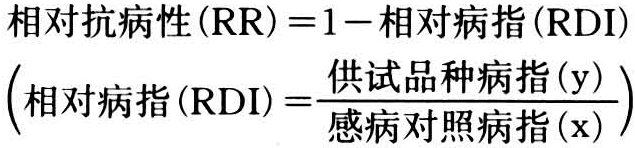 相对抗病性的准确程度取决于对照品种的病情,当对照品种发病率在95%左右时,相对抗病性代表真实的抗病性。诱发强度过大,供试品种与感病的对照品种病情指数差距小,相对病指增高,相对抗病性降低;反之,相对抗病性升高,都不能确切地反映供试品种的真实抗病性。⑤相对抗性指数法。此法可消除对照品种和诱发强度对抗病性表现的影响,真实反映抗病性的功能,其计算公式为: