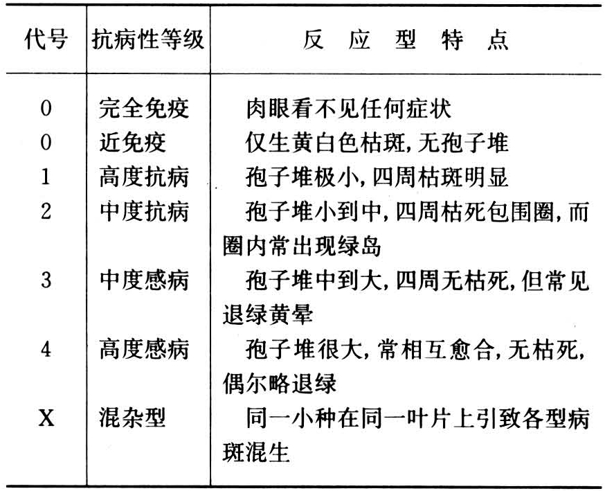 用相对的等级标准评定植株发病轻重程度,确定一个品种的抗病性。其方法有:①定性评定法。根据植株个体的病害症状,确定反应型或侵染型,划分抗病性等级。反应型的特征包括侵染点及其周围细胞坏死反应状况,病斑大小、色泽,产孢数量等,专化抗病性的病害采用定性评定法。小麦秆锈病的反应型分级标准见表。②定量评定法。根据病害的群体表现,统计病害发生普遍率(百分率),严重度和病情指数,划分抗病性等级。各种病害都可采用定量评定法。分为病情直接评定法,相对抗病性法和相对抗性指数法等。③病情直接评定法。直接按照病害普遍率或病情指数等病情程度划分抗病性等级,如小麦腥黑穗病等系统性侵染的病害,病穗率<10%为抗病,>40%为高度感病,10%~40%为中度感病。④相对抗病性法。按照供试品种与对照品种的病情指数相比较评定的抗病性,用于局部性侵染病害,其计算公式为: