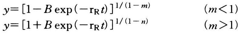 式中,rR为速率参数;m为斜率参数,其值可以从0到无限大。当m=0时,模型可转化为指数模型,当m=2时,则转化为逻辑斯蒂模型(见逻辑斯蒂模型),而m接近1时可转化变为冈伯茨模型(见冈伯茨方程)。因此,这是一个可塑性很强的模型(见图)。该模型的积分形式为: