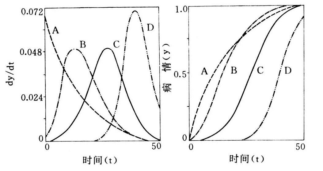 常数B也随m值而变。当m<1时,B=1-y0(1-…,当m>1时,B=y0(1-m)-1,式中,y0为y的初始值。本模型具有很好的适应性,可以用于植物病害流行动态描述。但由于m值不好确定,其实用性不如逻辑斯蒂模型或冈伯茨模型。(肖悦岩)