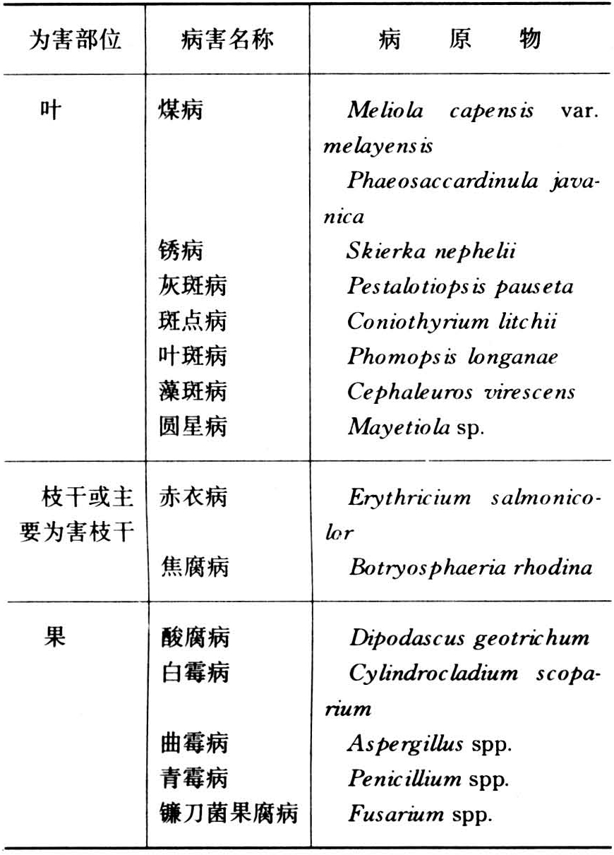 至1919年中国已报道近20种。重要的有霜疫病、毛氈病、炭疽病和贮藏期病害。霜疫病1934年中国最早报道于台湾省,大陆50年代初记载,现以广东、福建的老产区病重。荔枝花、幼果、熟果、果柄、果枝均被害,高湿时还为害嫩叶,病叶局部褪绿、病枝局部变褐,病花和幼果早落,熟果上病斑不规则,无边缘,红褐色,最终果肉发酸,腐烂淌水,潮湿时病部生白霉层,即病菌子实体。