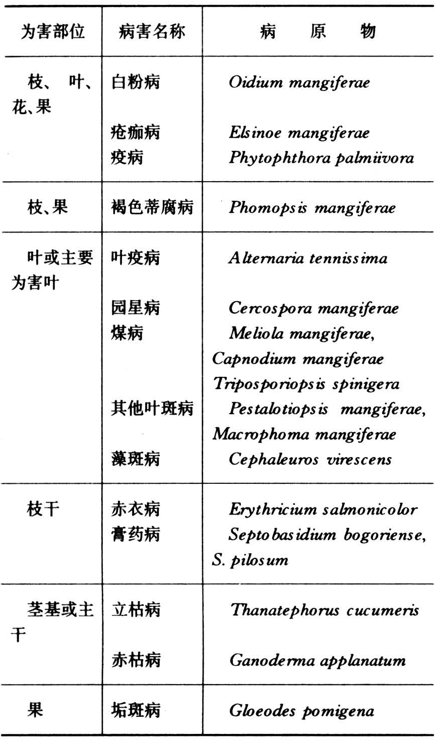 世界已知60多种,至1991年中国已报道30多种。最重要的是炭疽病、白粉病、细菌性黑斑病、叶缘叶枯病及贮藏期烂果。炭疽病是杧果最严重的病害,引起芽接苗回枯、叶斑、枝梢凋萎、花腐、枝枯、果腐等症状。病原物为围小丛壳(Glomerella cingulata),属子囊菌,球壳目,无性态为胶孢炭疽菌(Colletotrichum gloeospo-rioides),属半知菌,黑盘孢目。