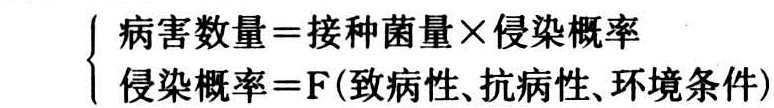 关于侵染概率的研究,开始于20世纪30年代。1932年美国霍斯福尔(J.G.Horsfall)提出“接种体势能”(inoculum potential)这一术语,一度曾被广泛使用,原意指接种体密度。1956年英国加勒特、(S.D.Garrett)在研究土传病害时发展了它的内涵,赋予质和量两方面涵意,既包括接种体密度又包括传播体萌发侵染的能力。1971年美国贝克((R.Baker)解释为接种体数量、生活力、致病性和环境条件的综合量。1986年中国曾士迈将病原物致病性、寄主抗病性和环境条件对侵染的作用综合为侵染概率值,用某种函数形式表示它们之间的关系,从而得出在任一环境条件下病害数量的表达式: