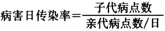 由于病原物的传播体(接种体)十分微小,绝大多数需要用显微镜观察,所以很难准确计数。在实际工作特别是田间试验中,常采用间接方法。即以散布体(接种用的病体)的位点数相对地代表接种菌量。位点数的单位可以是病株、病叶、病斑。用下述公式计算病害日传染率: