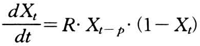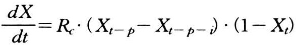 由于病害具有潜育期p,肉眼未见症状的寄主又可分为未受侵染的和虽然已受侵染但尚处于潜育阶段的两部分,可供侵染的部分仍为未受侵染的寄主(1-Xt),而起传播侵染作用的是已经显症的部分(Xt-p)。按此考虑,侵染速率公式应该改写为: