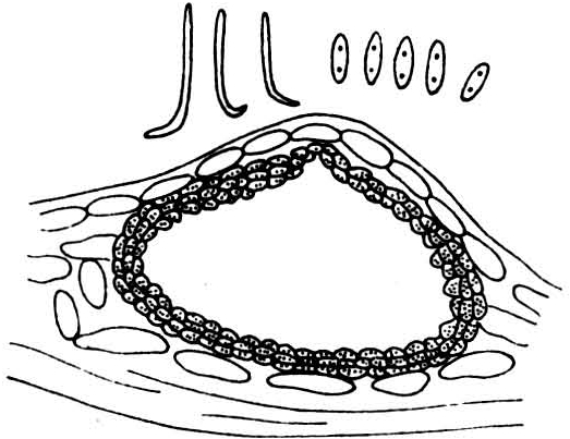 分生孢子座为真子座,发达,分散,生寄主表皮下,锤状,后顶破树皮外露;子座暗褐色,含多腔呈迷宫状或螺旋状。具一个共同的中心孔口;分生孢子梗不规则分枝,无色,具隔膜;产孢细胞无色,光滑,直,内壁芽生瓶体式产孢,围领及产孢口小;分生孢子腊肠状,单胞,薄壁、无色,光滑,不含油球,孢子角常有色。有性态属黑腐皮壳属。分布世界各地。引起多种植物树干和枝条腐烂病和溃疡病。已描述100余种,中国报道10种。常见种有引起苹果腐烂病的东北壳囊孢(C.mandshurica Miura),引起杨树溃疡病的金黄壳囊孢[C.chryso-sperma(Pers.)Fr.]和引起梨腐烂病的梨壳囊孢(C.carphosperma Fr.)。