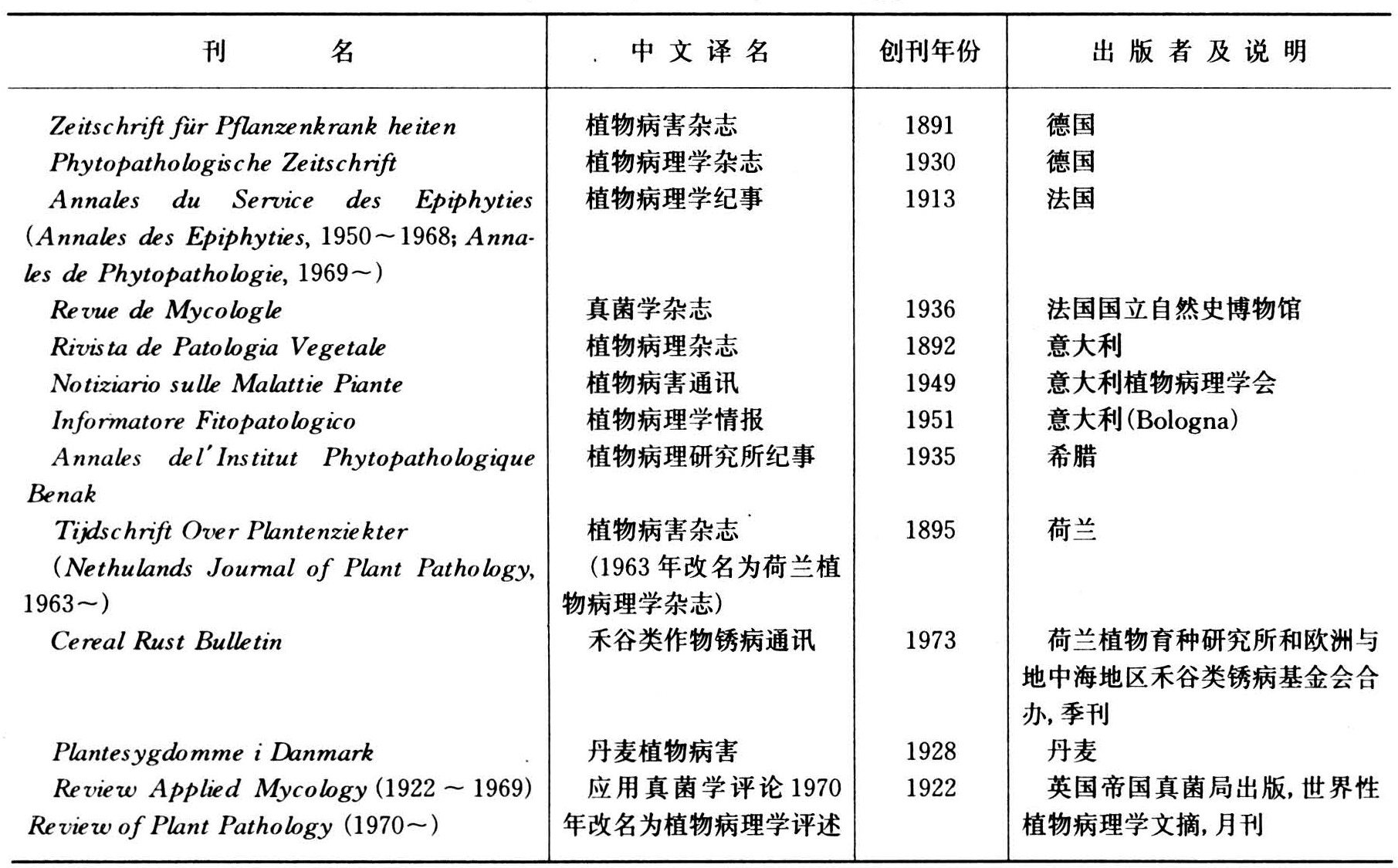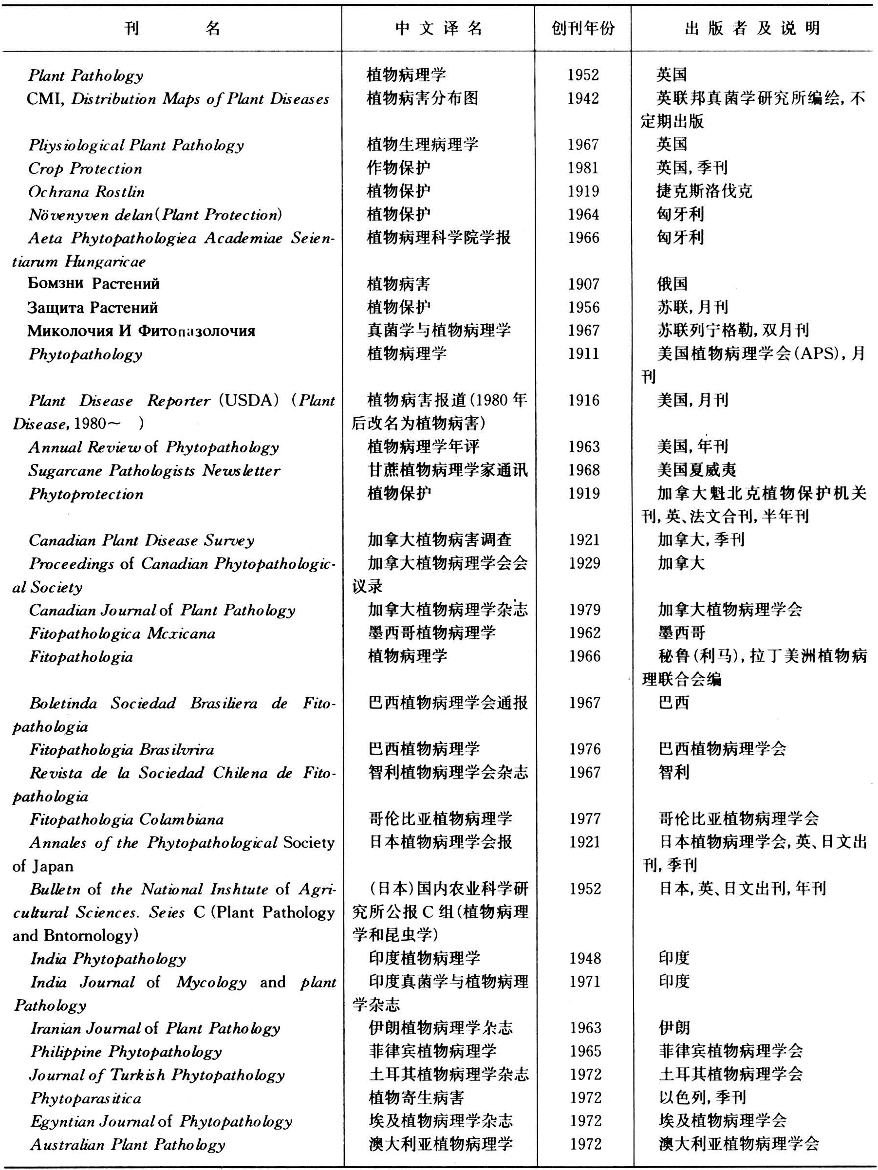 自19世纪80年代以来,一些国家先后出版的有关植物病理学期刊已有60多种,其中主要的见下表。